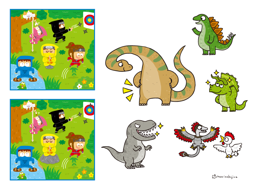恐竜のイラストと、忍者のまちがいさがしのイラストを描きました。