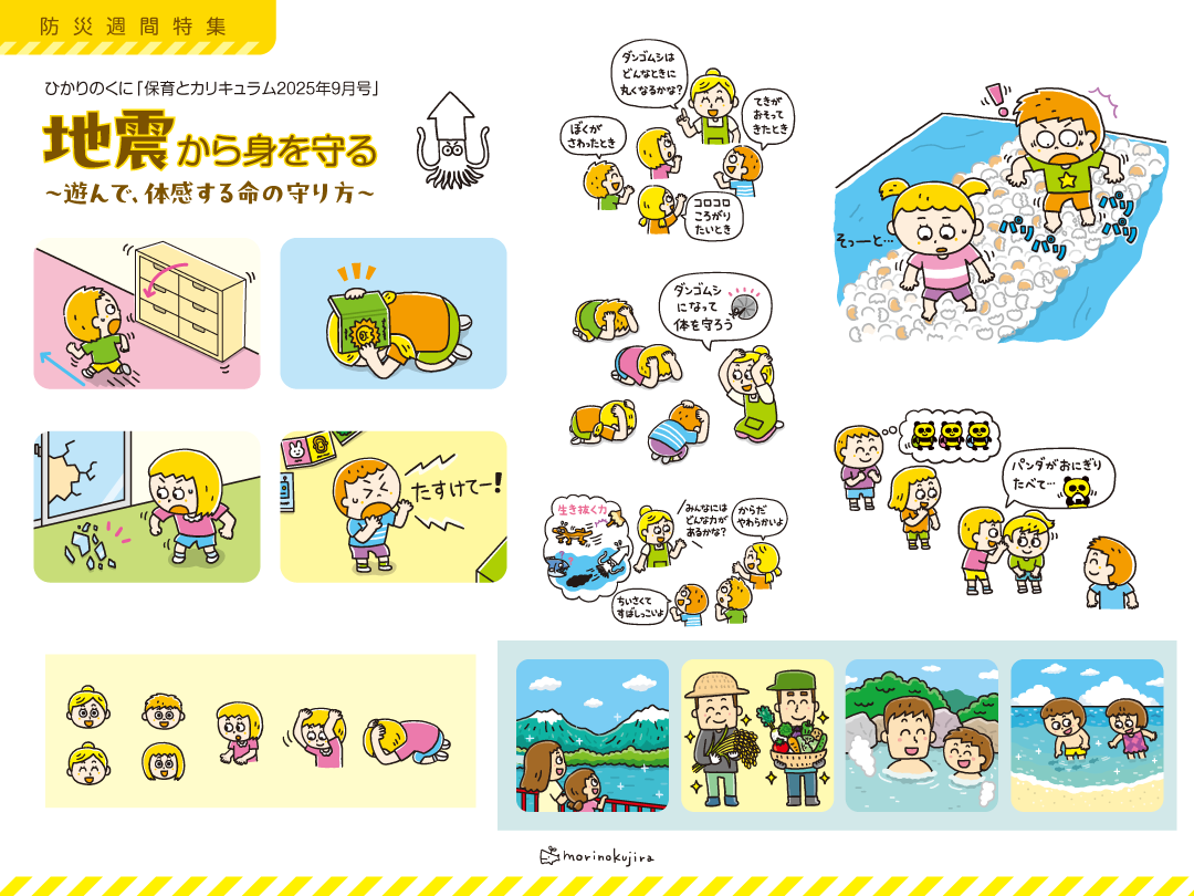 避難訓練やふだんの保育で取り入れられる、防災教育のアイデアを紹介する特集のイラストです!