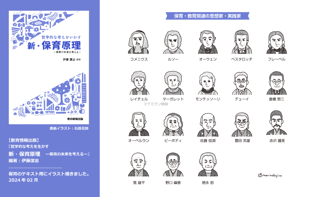 保育テキストにて、保育・教育関連の思想家・実践家の似顔絵他を描きました。