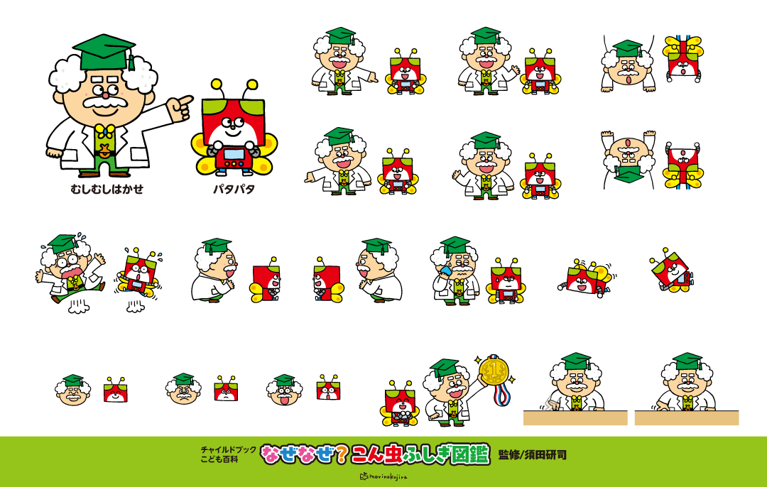 案内役の「むしむしはかせ」とロボットの「パタパタ」のキャラクターを作りました。