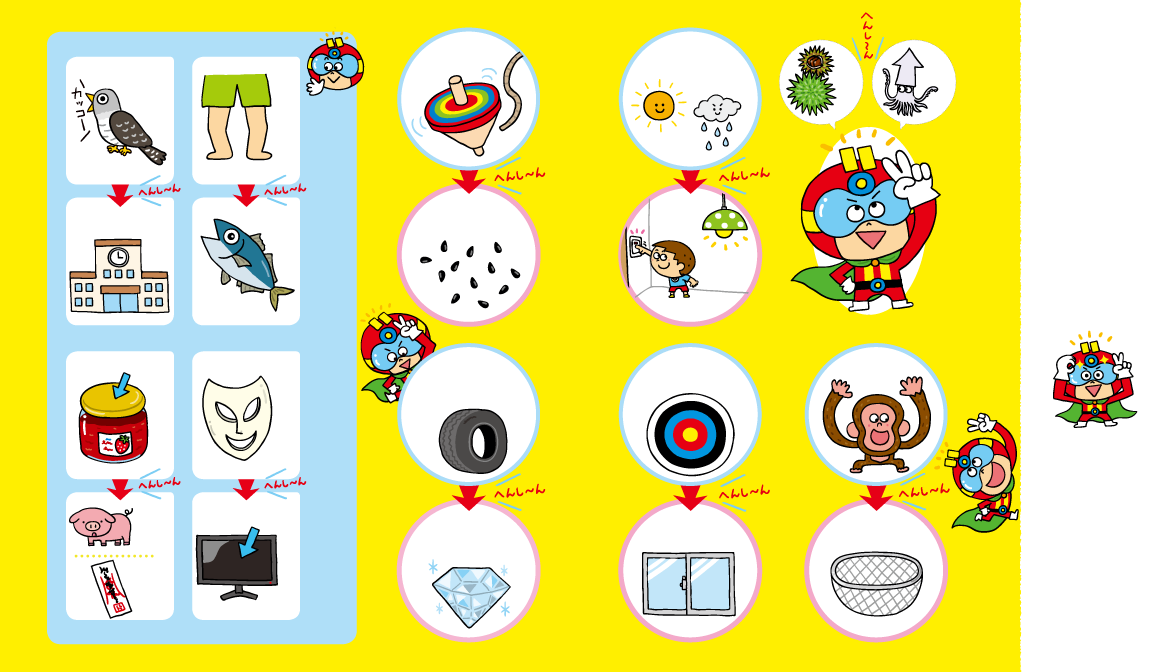 てんまるマンとともにへんしんことばを見てみよう!なイラストです。