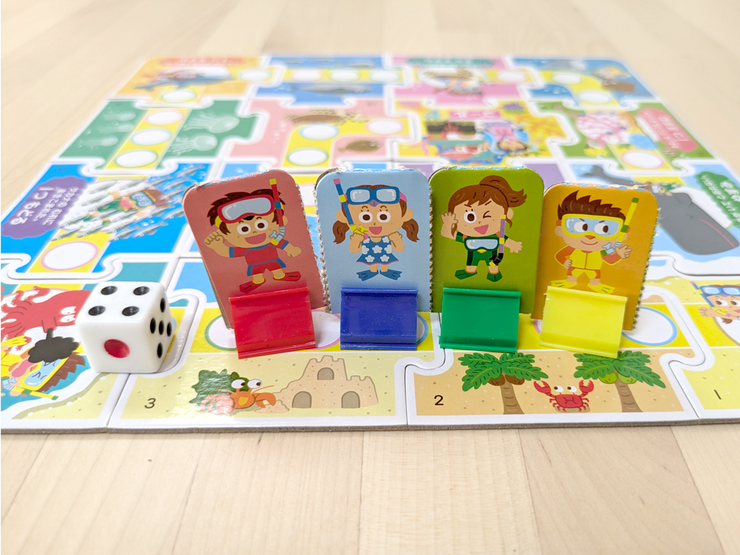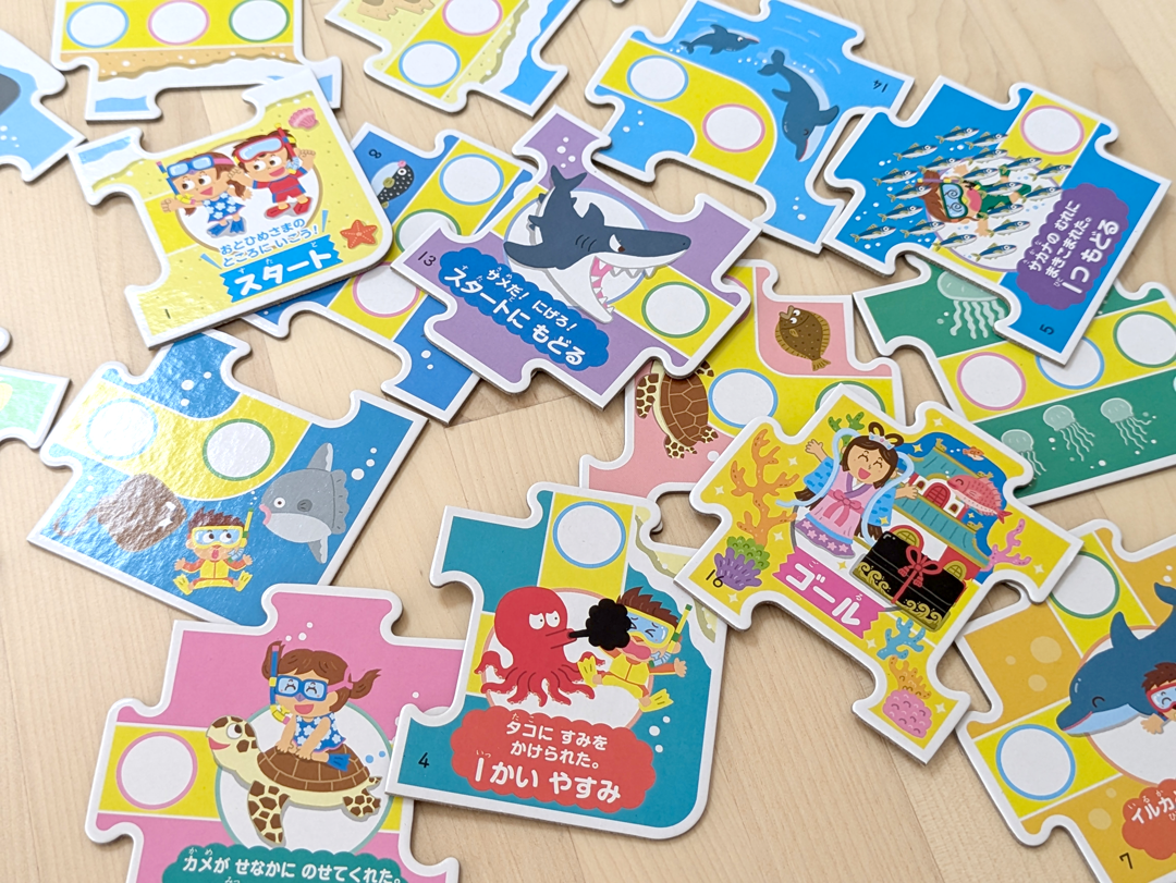 パズルのピースを好きなように組みかえて、遊ぶことができるすごろくです。
