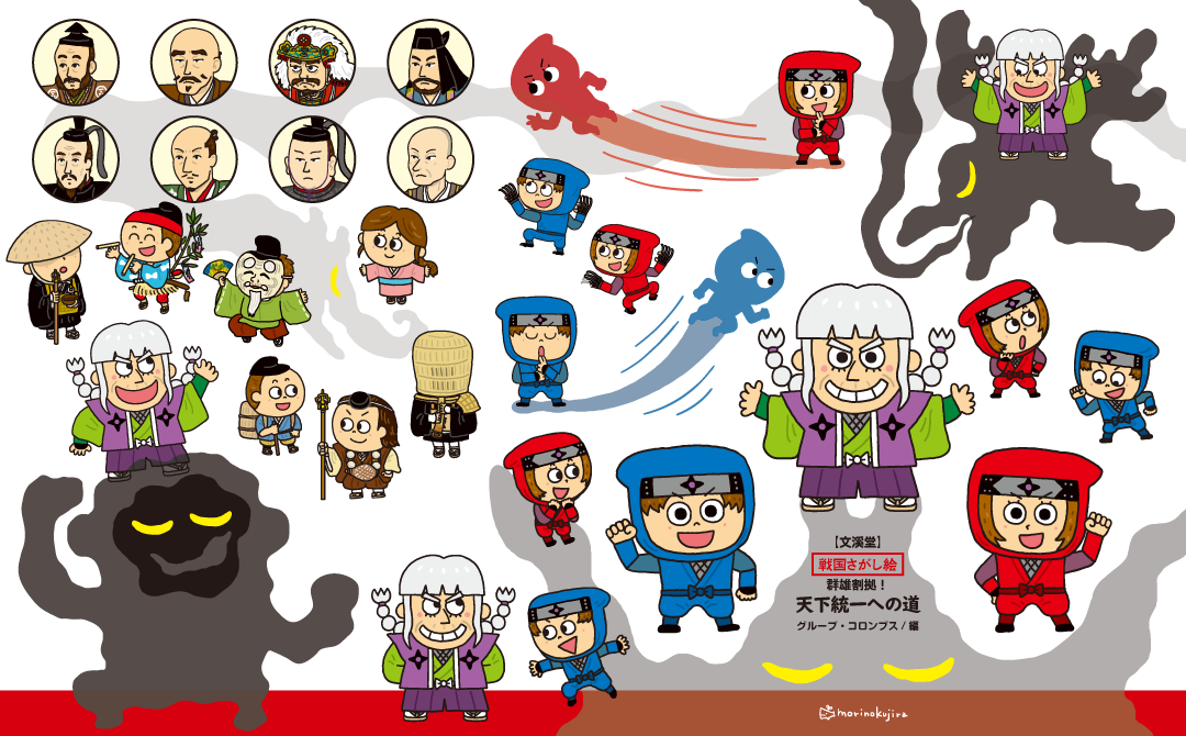 案内役忍者のおばば・青影・赤影と謎の影と、戦国武将のイラストを描きました。